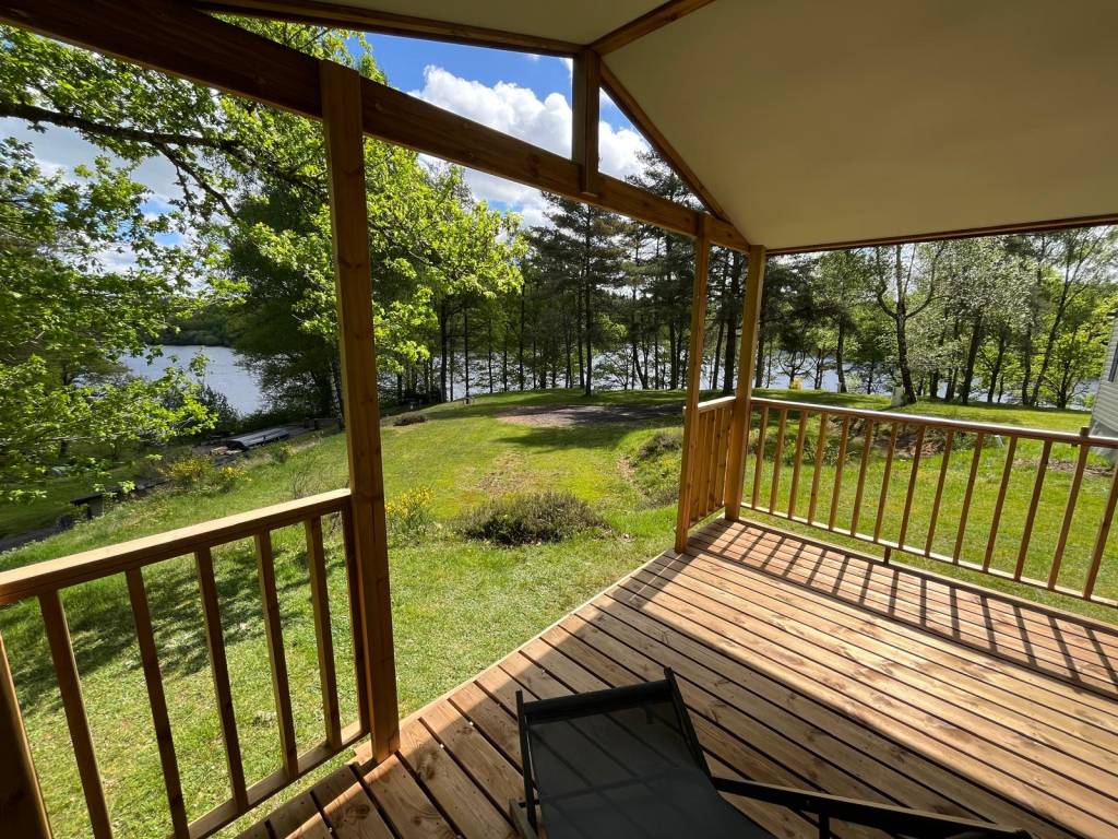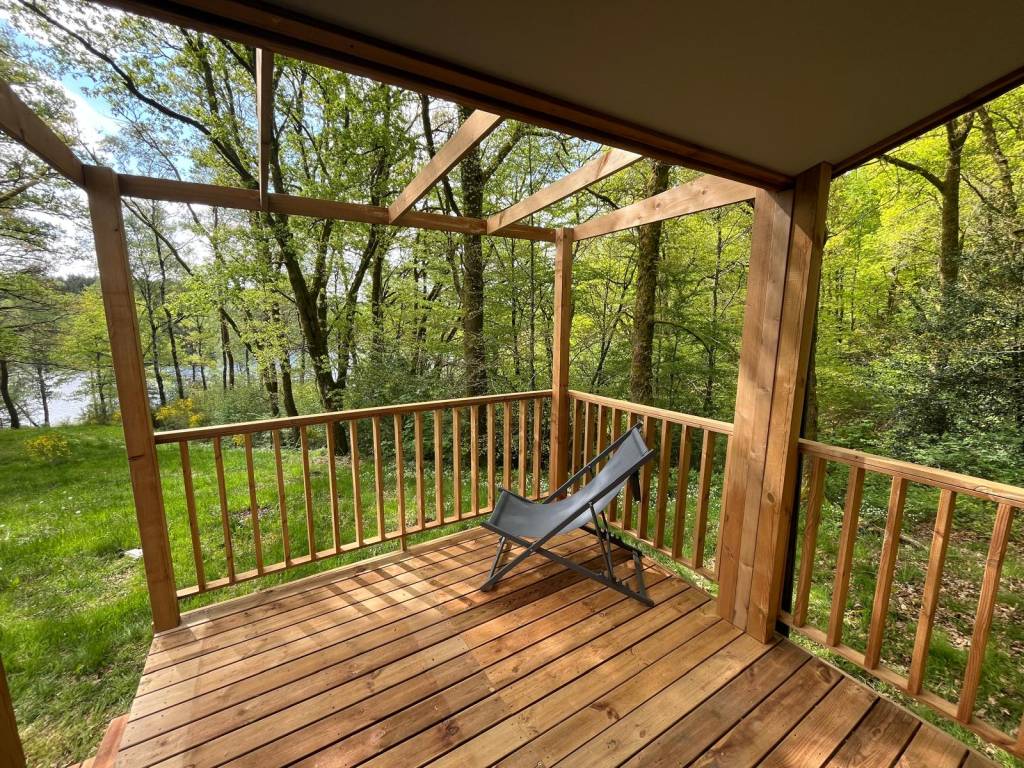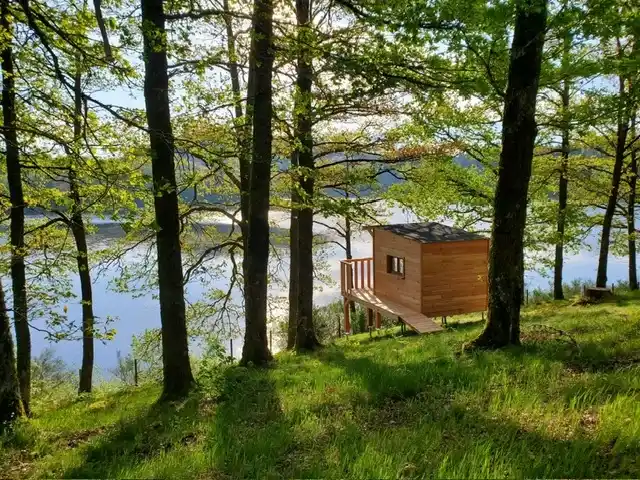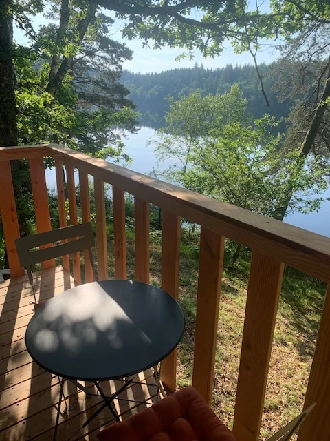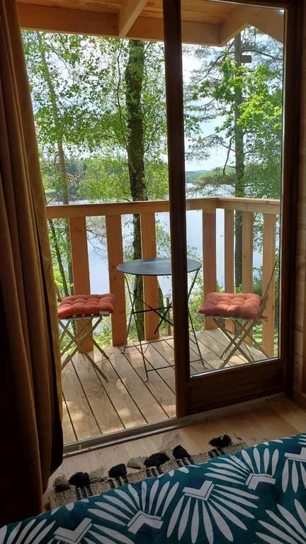 Cabane en bois sur pilotis offrant une terrasse avec vue directe sur le lac, pouvant accueillir 2 personnes.