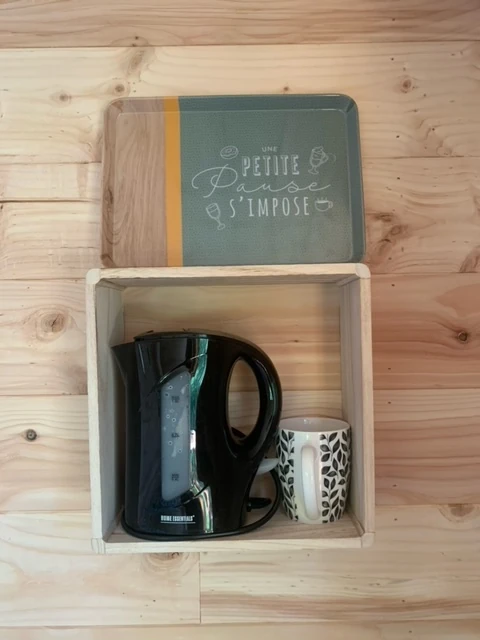 Cuisine aménagée et équipée: vaisselle,micro-onde,cafetière,bouilloire,four.